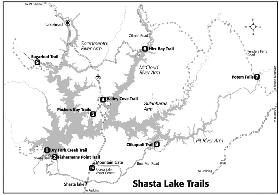 The closest hiking trail, Sugarloaf Trail, is 4.4 miles south of Waterfall Cottage on Lakeshore Drive. It is 1 of 8 hiking trails around the perimeter of Lake Shasta (see map below).