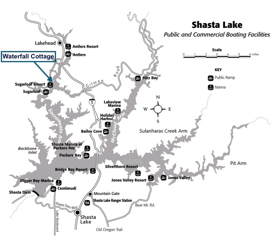 Bring your fishing gear! Lake Shasta, the largest reservoir in California, ranks #2 on Fishmaster's Top 30 Fishing Lakes in California! Waterfall Cottage is located on the Sacramento River arm of the lake which is renowned for its abundance of bass. (McCloud, Squaw Creek and Pit rivers make up the other three main arms of the lake.) Lake Shasta is home to a variety of fish species, including bass, trout, salmon, catfish, and crappie. Shoreline fishing is available across the street from Waterfall Cottage. For anglers with boats, see the Boating section below.